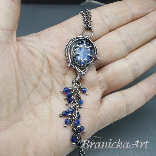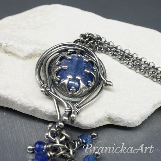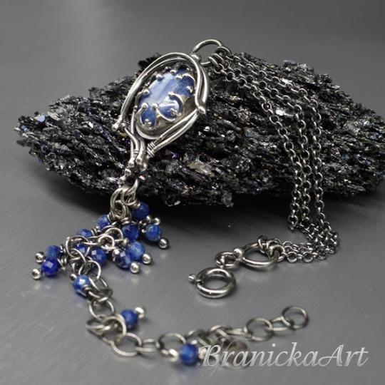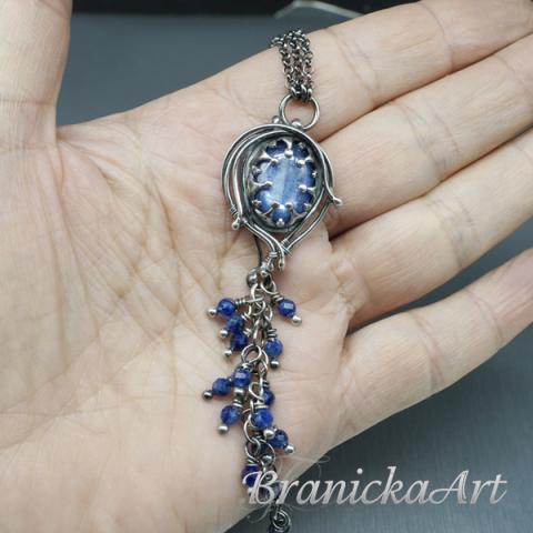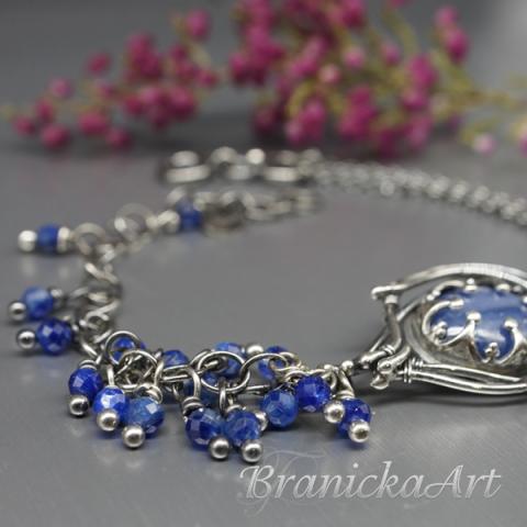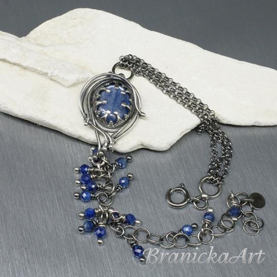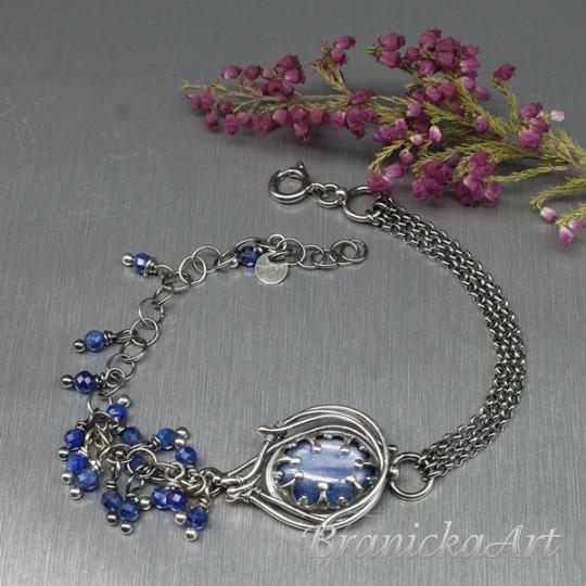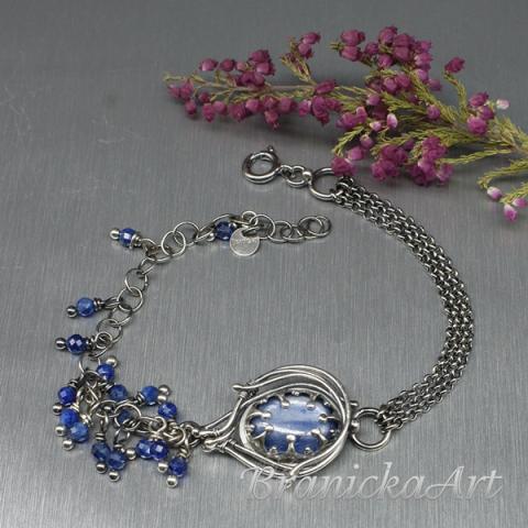 Elegancka, srebrna bransoletka dla miłośniczki koloru niebieskiego. Wykonana z połyskującego kianitu oprawionego w srebrno, oraz drobnych, fasetowanych kuleczek tego samego minerału. Kuleczki kianitów zebrałam w długie grona. Bransoletkę przyczerniłam i dokładnie wypolerowałam. Ciemne srebro pięknie kontrastuje z blaskiem minerałów. Tylko jedna taka sztuka.